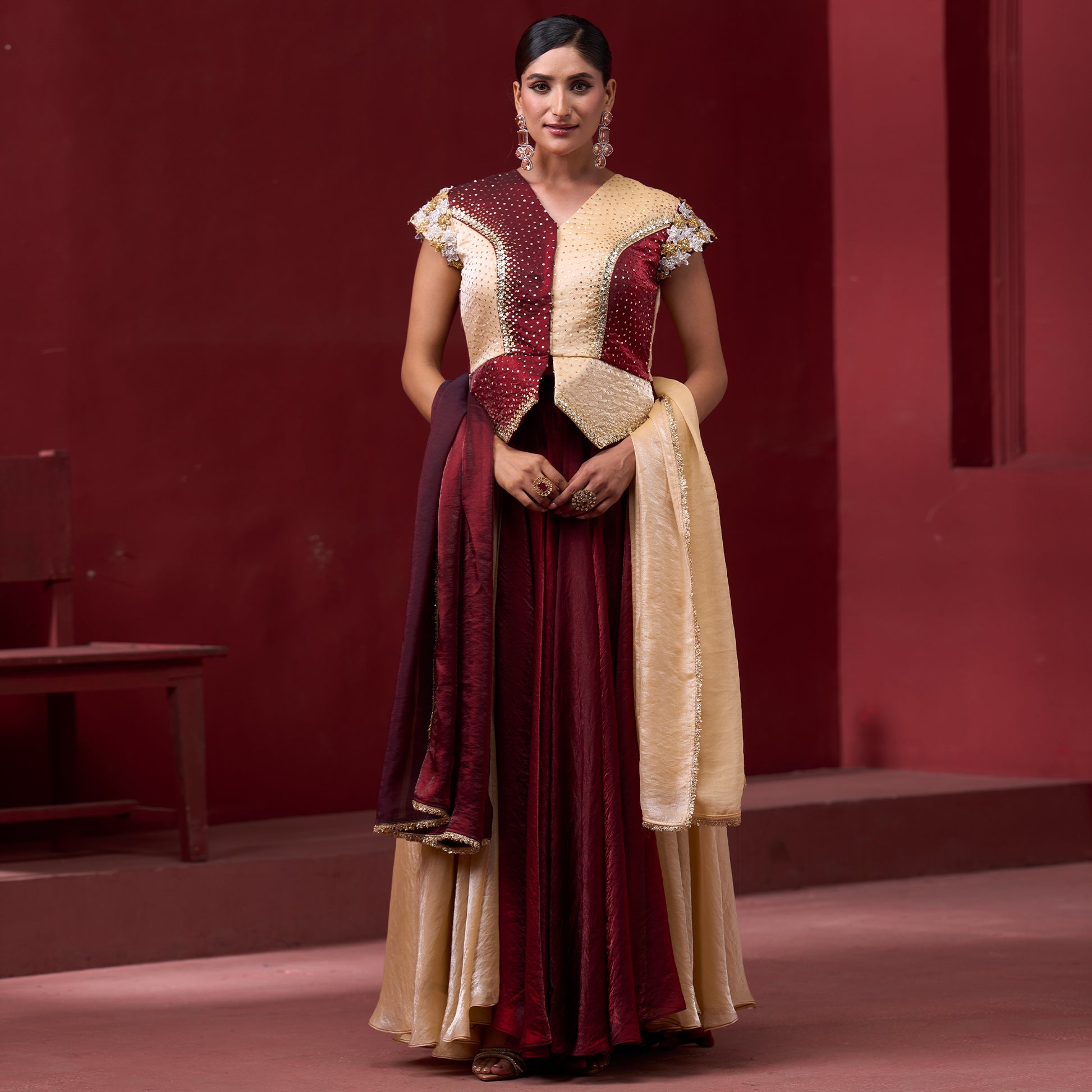 Drape Red & Cream Skirt with Embellished Top and Dupatta