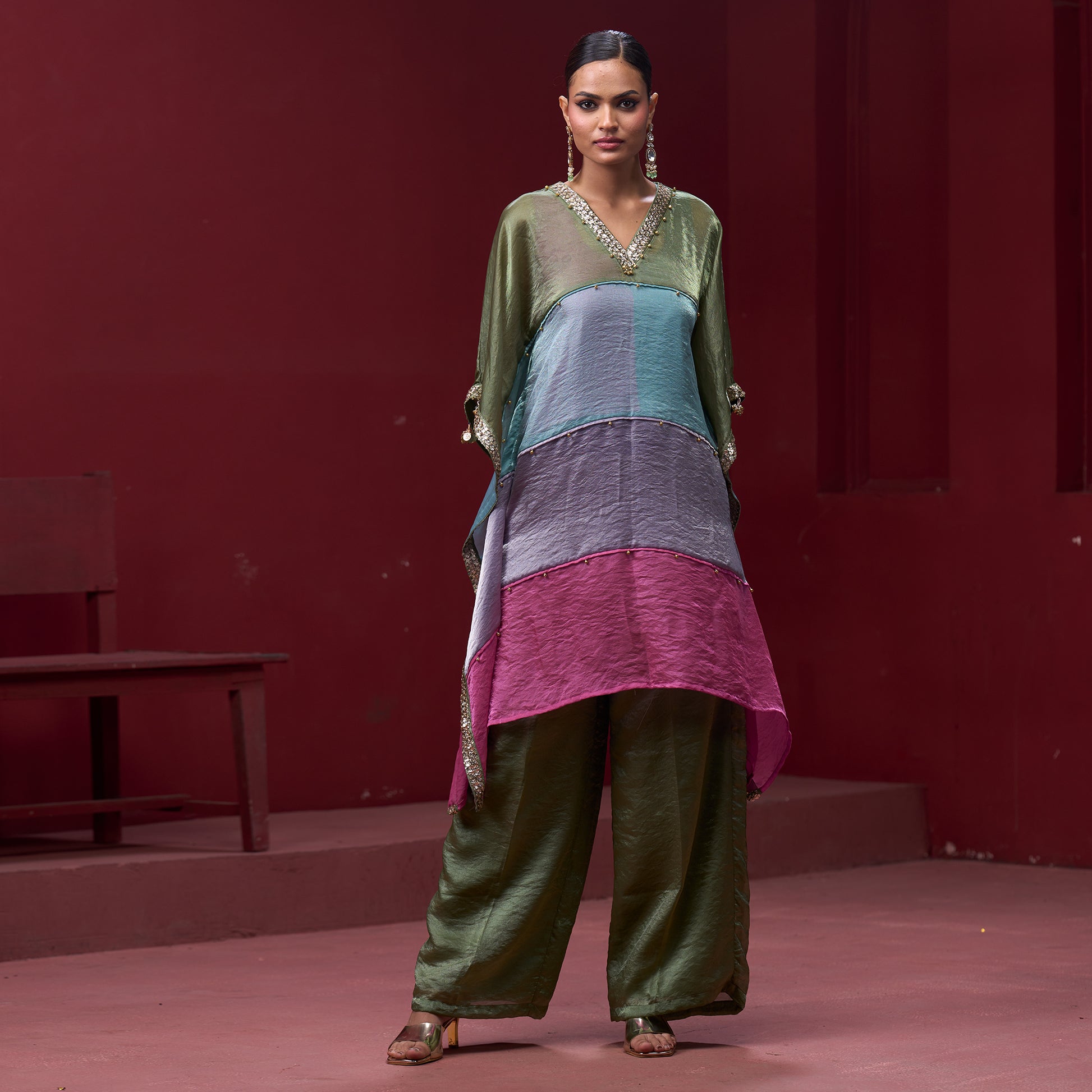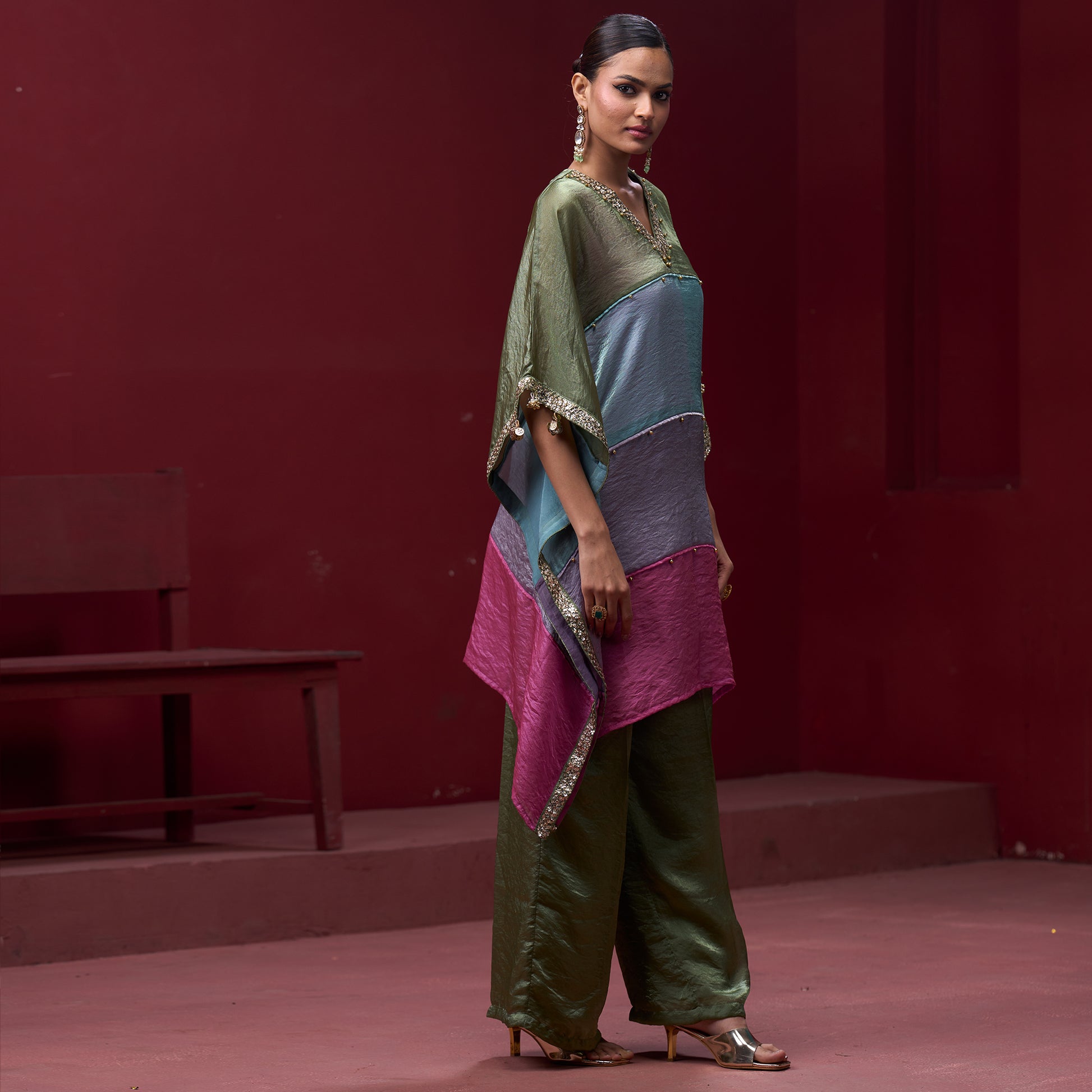 Indulge in effortless sophistication with this stunning embellished neck kaftan set from the Shimmer & Sheen 2026 collection. Rendered in luxurious metallic tissue fabric, this fusion piece features intricate hand-embroidery concentrated at the neckline, creating a focal point of refined artistry. The flowing silhouette in captivating purple and green tones offers both comfort and elegance, while the shimmering metallic finish ensures you radiate luminous beauty. Expertly designed for weddings and festive celebrations, this kaftan set seamlessly merges traditional embroidery techniques with contemporary design, delivering a distinctive look that celebrates cultural heritage with modern sensibility.