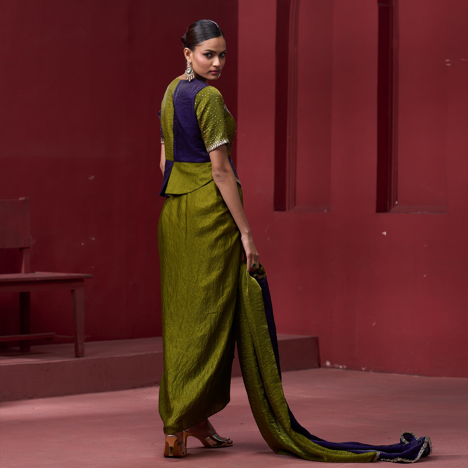 Drape Purple & Green Skirt with Embellished Top and Dupatta