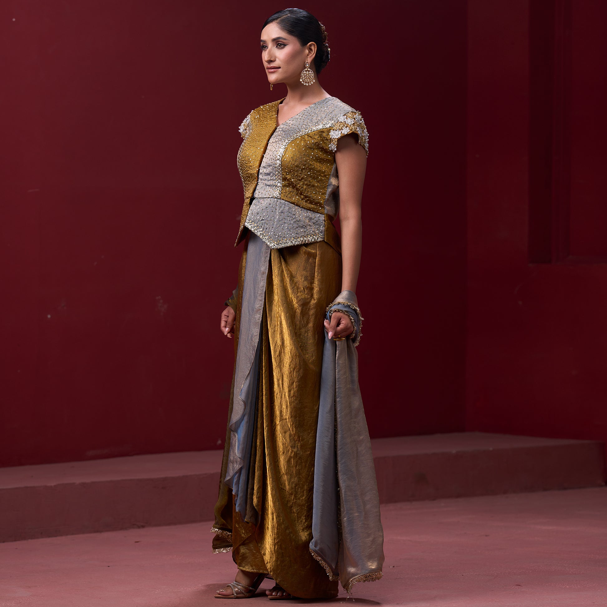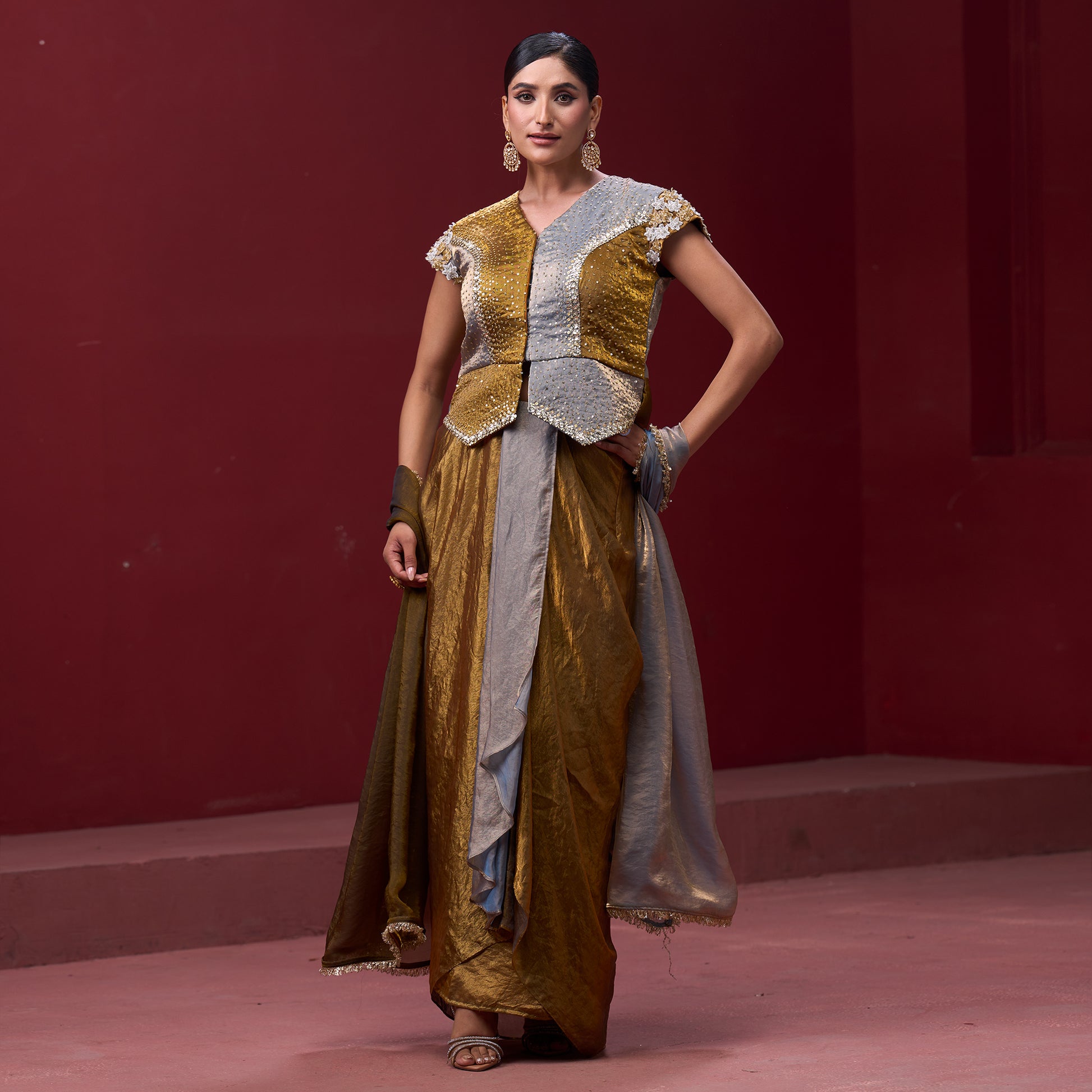 Elevate your festive wardrobe with this captivating embellished top and flare skirt pairing from the Shimmer & Sheen 2026 collection. Crafted from sumptuous metallic tissue fabric, this fusion set combines a meticulously hand-embroidered top with a voluminous flared skirt that moves with grace and poise. The shimmering metallic weave creates an enchanting luminosity, while the intricate embroidery adds layers of visual interest and sophistication. Designed for weddings and special occasions, this ensemble represents the pinnacle of artisanal excellence, offering you a distinctive silhouette that honors traditional craftsmanship while embracing contemporary style and undeniable allure.