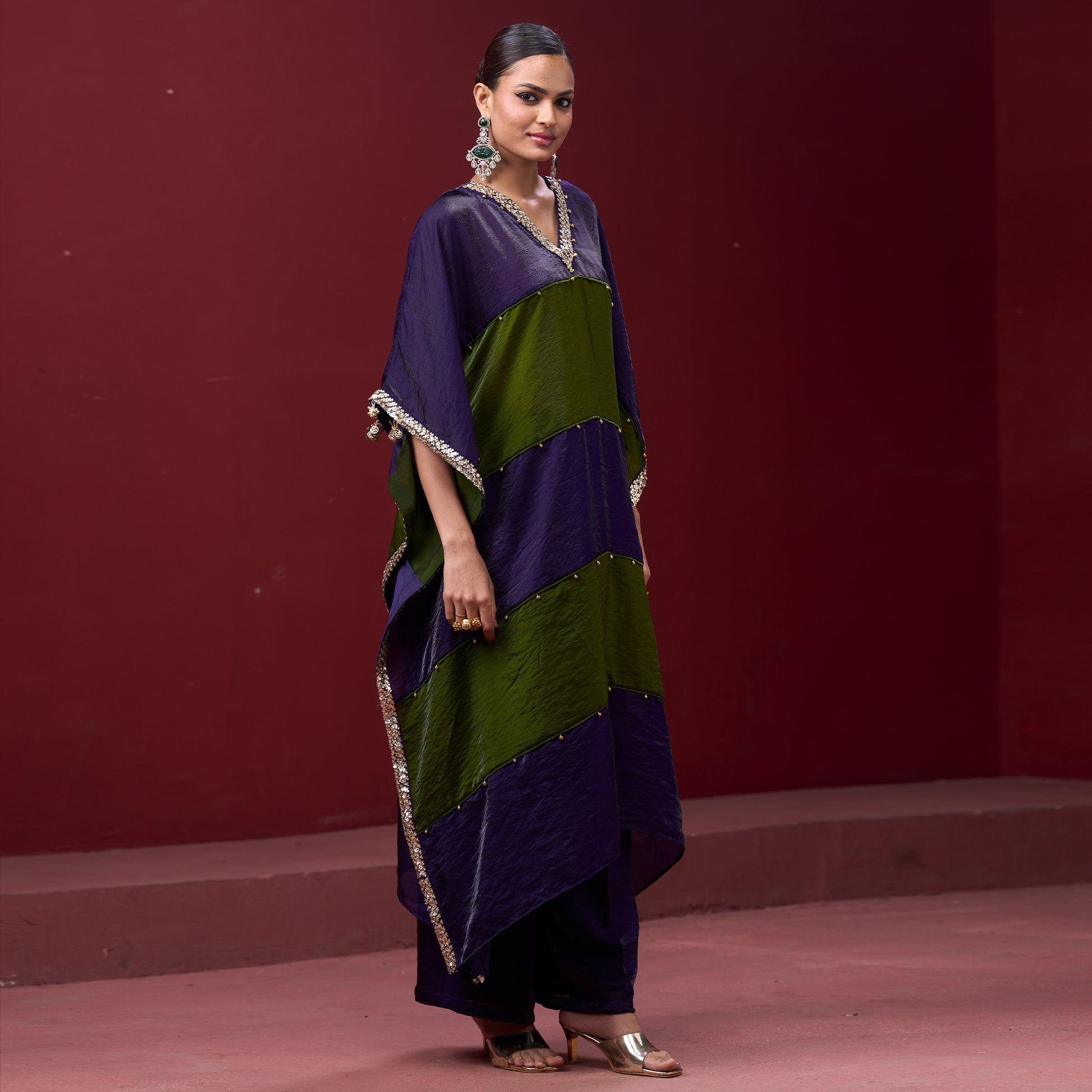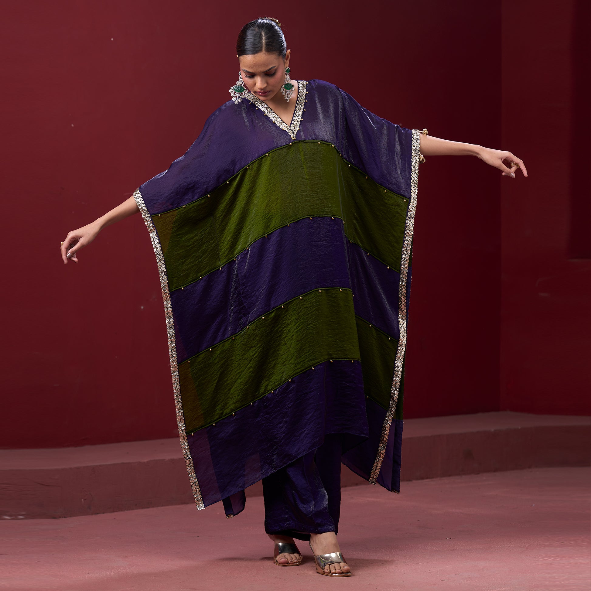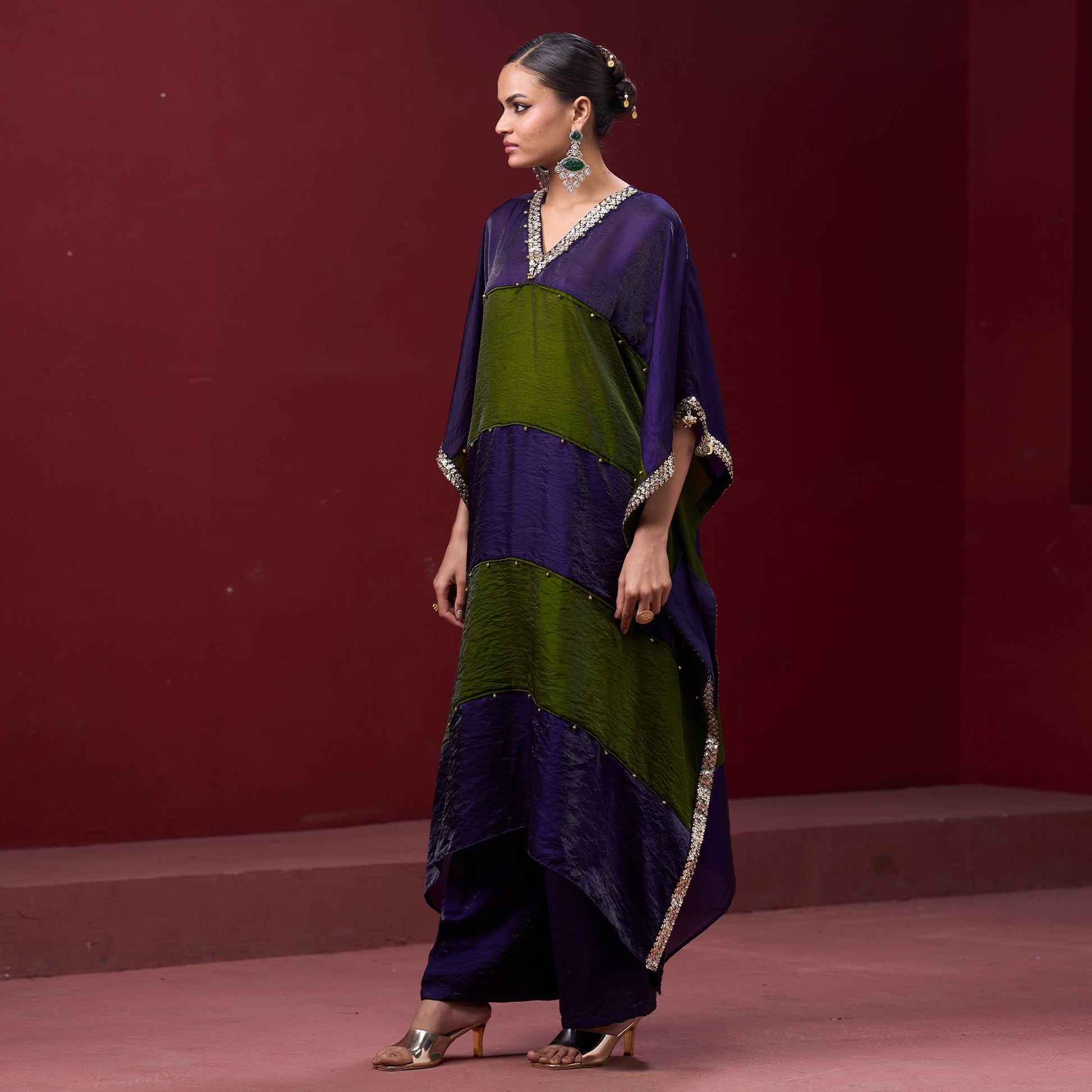 Indulge in effortless sophistication with this stunning embellished neck kaftan set from the Shimmer & Sheen 2026 collection. Rendered in luxurious metallic tissue fabric, this fusion piece features intricate hand-embroidery concentrated at the neckline, creating a focal point of refined artistry. The flowing silhouette in captivating purple and green tones offers both comfort and elegance, while the shimmering metallic finish ensures you radiate luminous beauty. Expertly designed for weddings and festive celebrations, this kaftan set seamlessly merges traditional embroidery techniques with contemporary design, delivering a distinctive look that celebrates cultural heritage with modern sensibility.