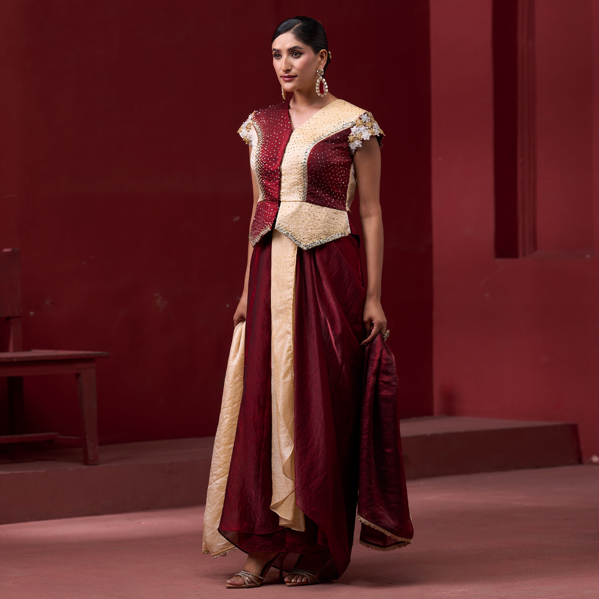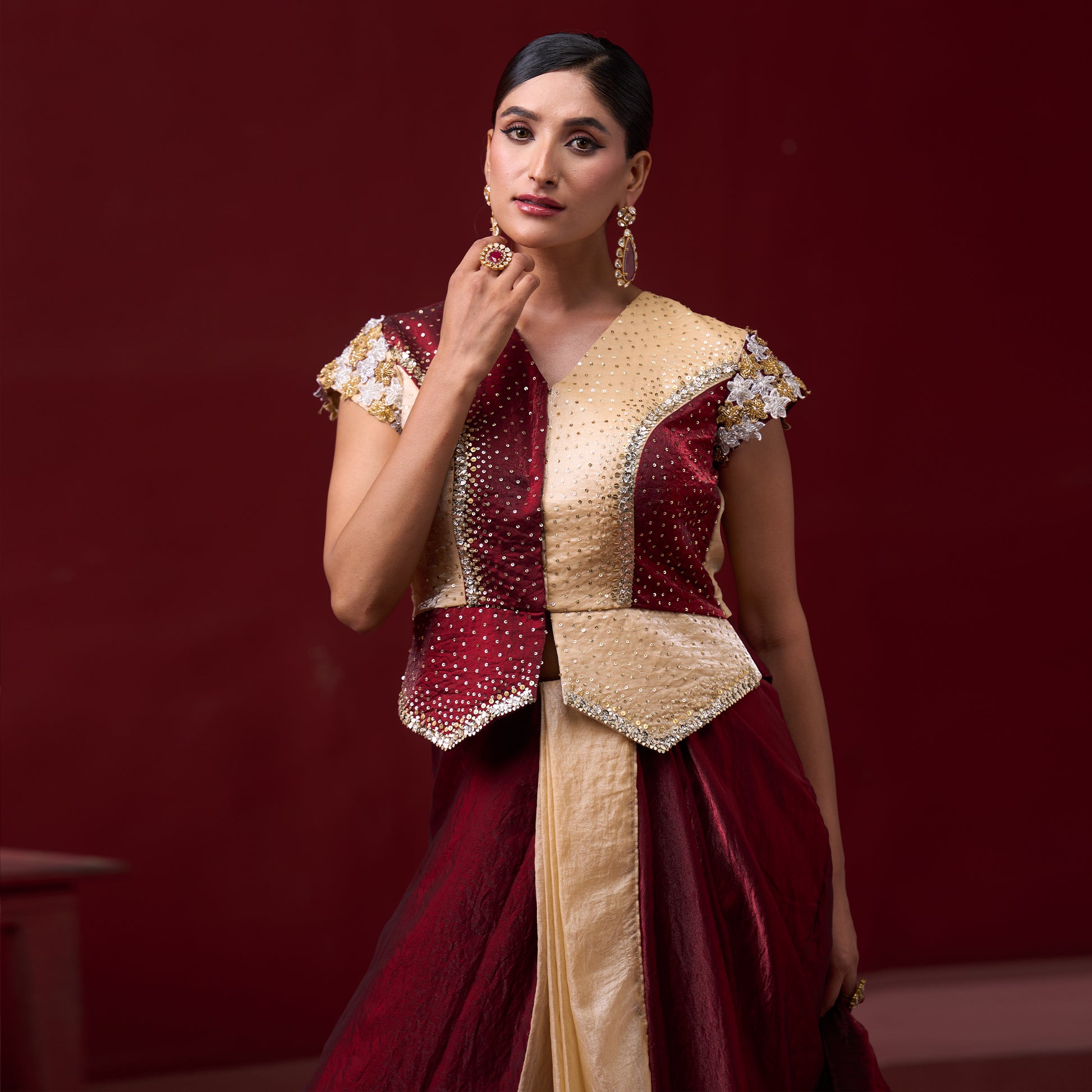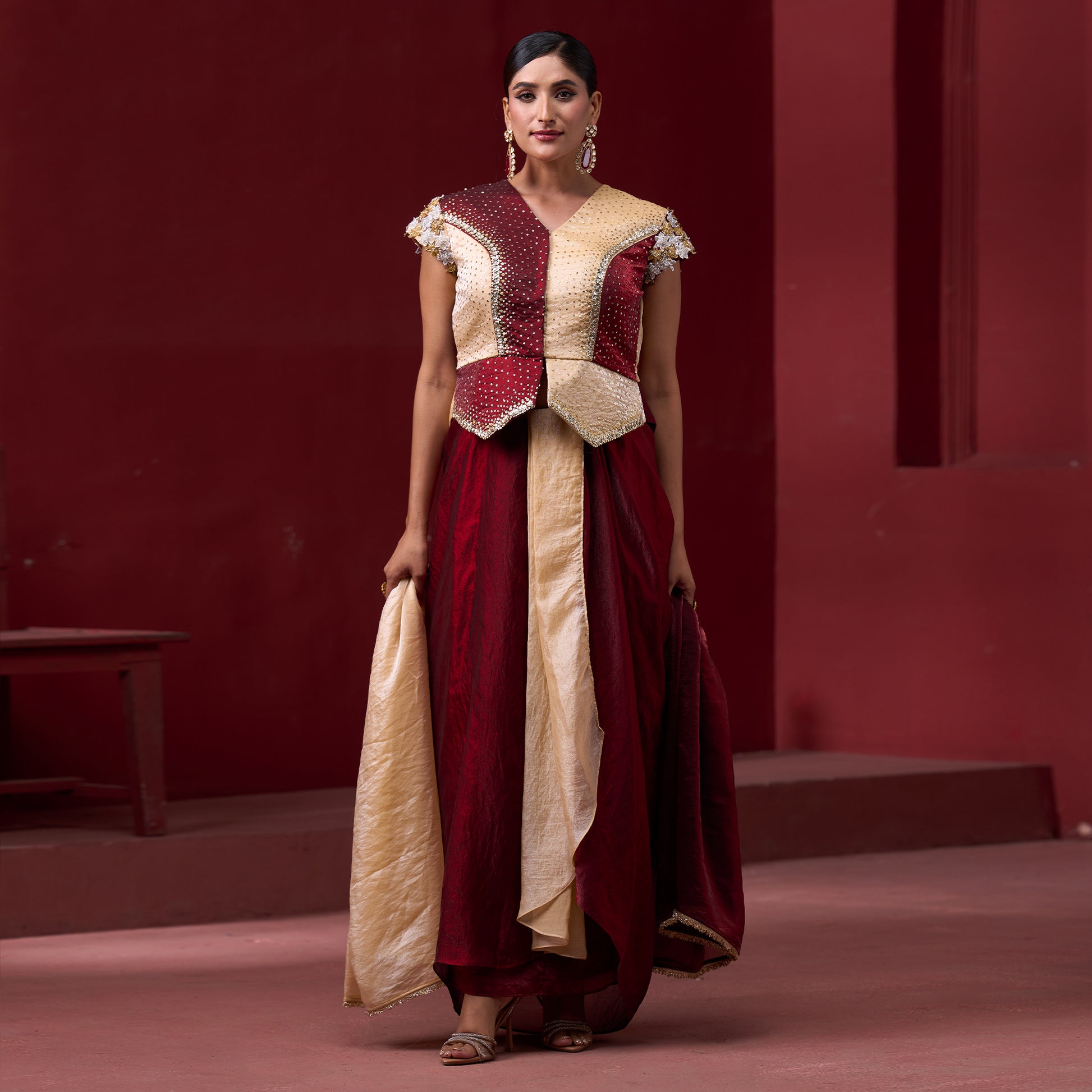 Embellished Red & Cream Top with Flare Skirt