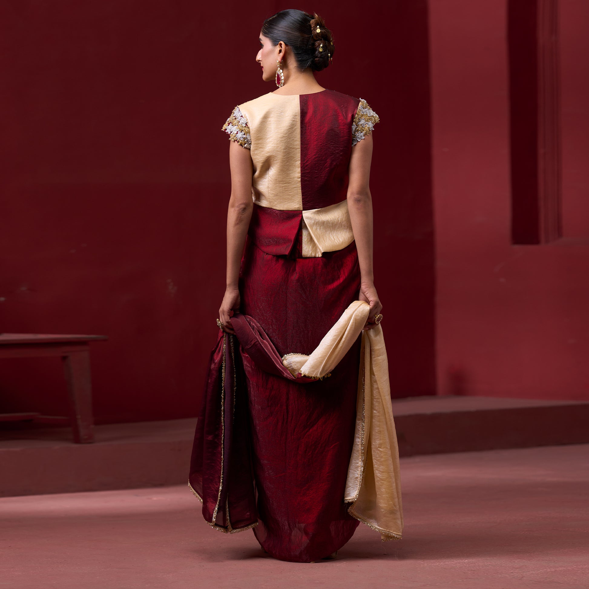 Elevate your festive wardrobe with this captivating embellished top and flare skirt pairing from the Shimmer & Sheen 2026 collection. Crafted from sumptuous metallic tissue fabric, this fusion set combines a meticulously hand-embroidered top with a voluminous flared skirt that moves with grace and poise. The shimmering metallic weave creates an enchanting luminosity, while the intricate embroidery adds layers of visual interest and sophistication. Designed for weddings and special occasions, this ensemble represents the pinnacle of artisanal excellence, offering you a distinctive silhouette that honors traditional craftsmanship while embracing contemporary style and undeniable allure.