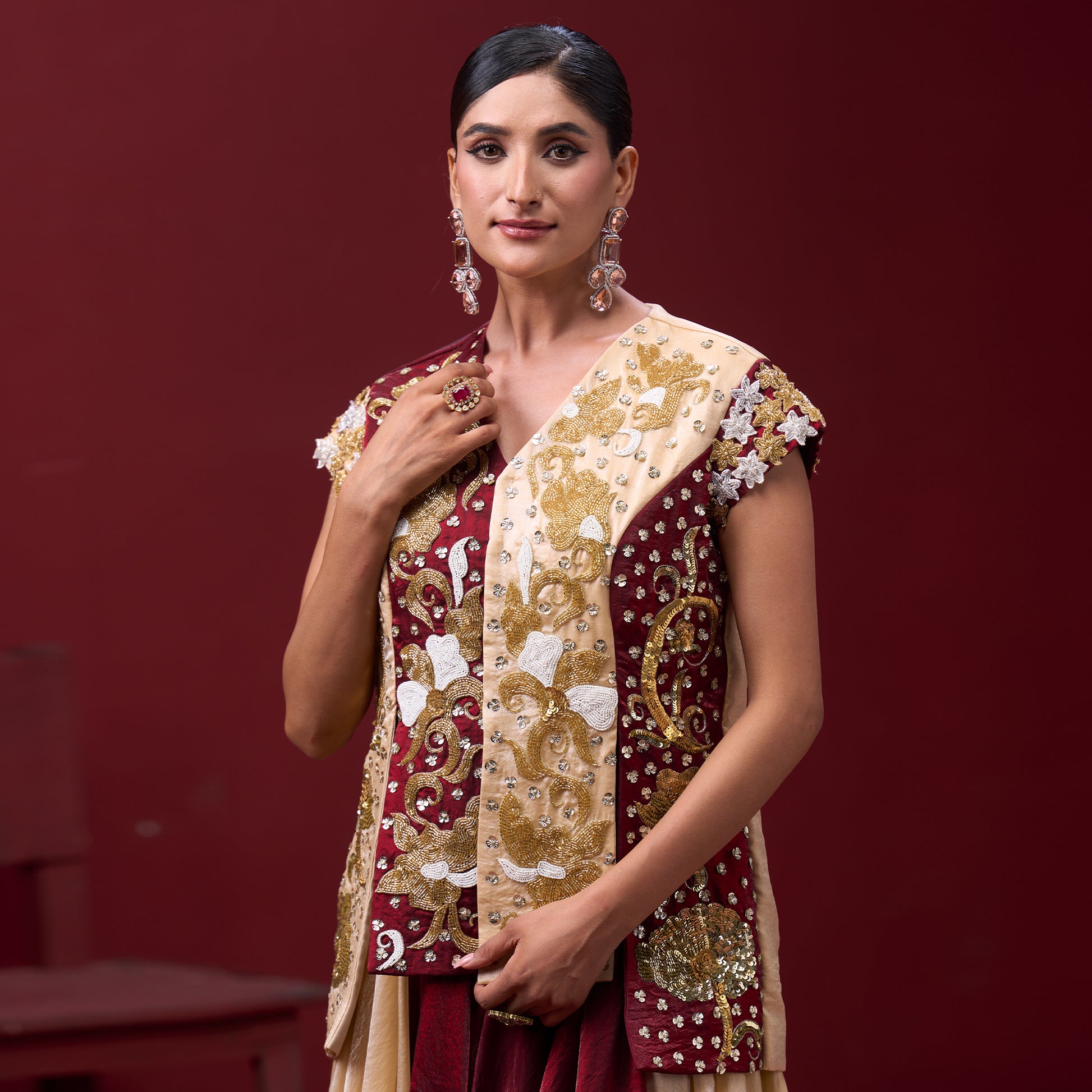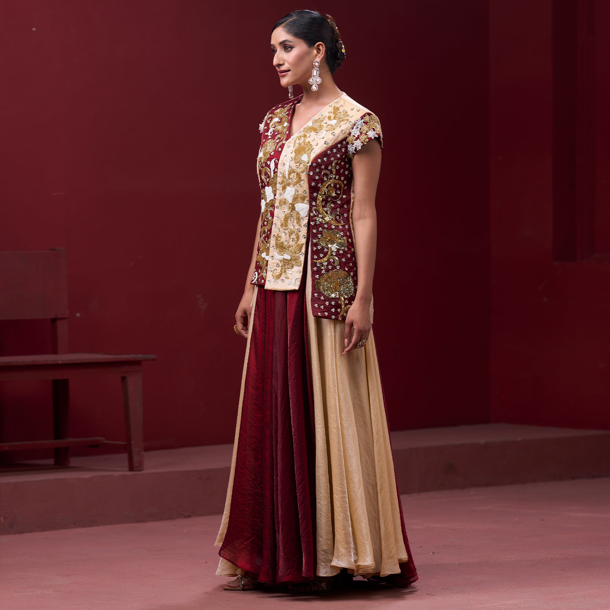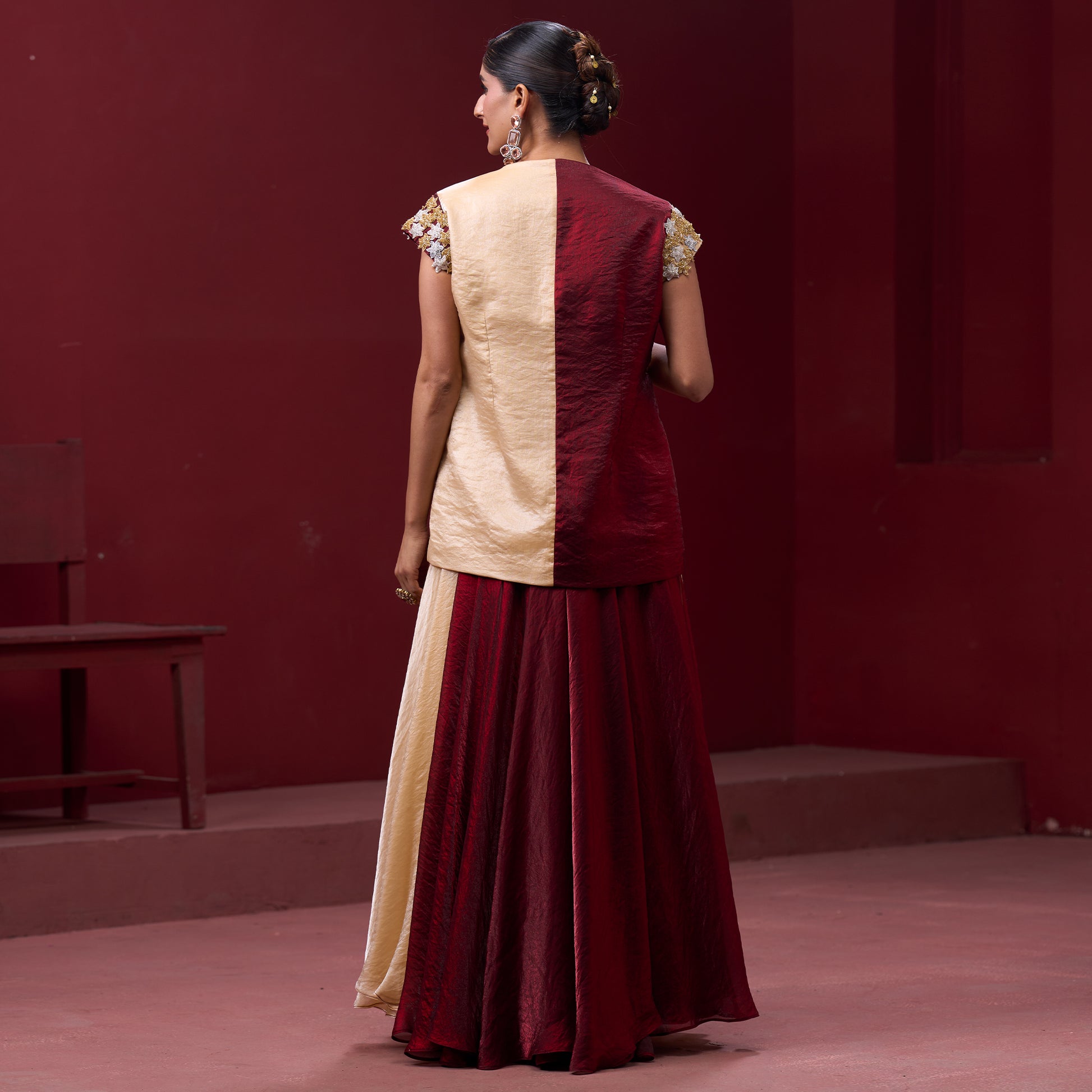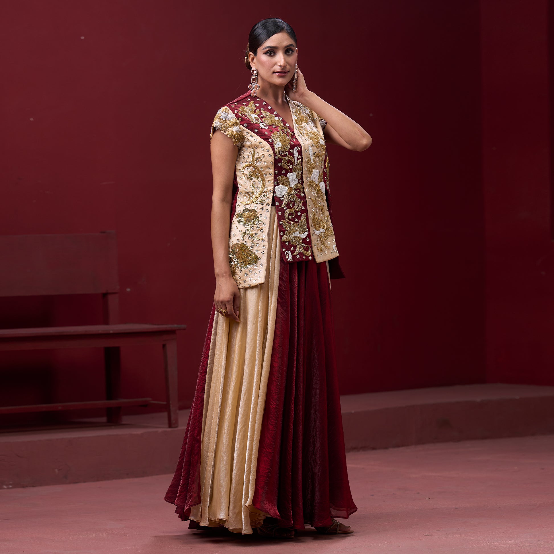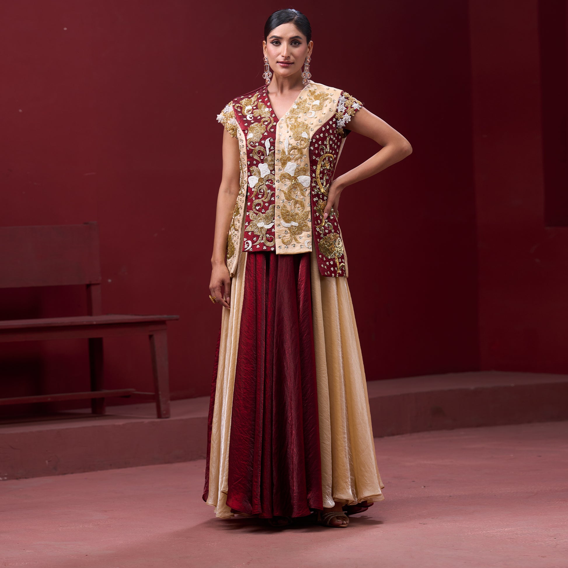Flare Red & Cream Skirt with Embellished Top